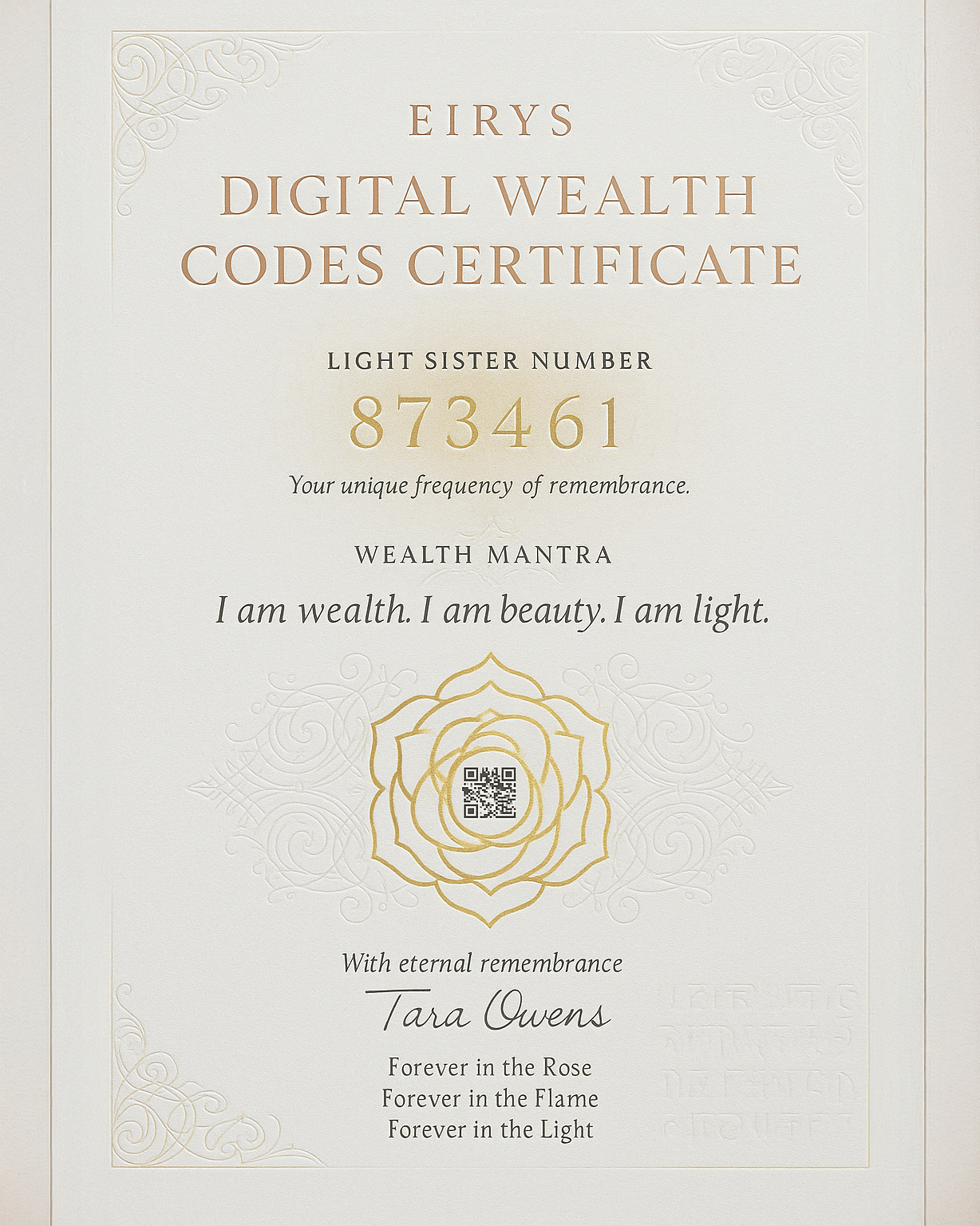 Within this sigil lives your Eirys Digital Wealth Codes Certificate, a sacred document created exclusively for you. Because the woman who was meant to find Eirys always does.